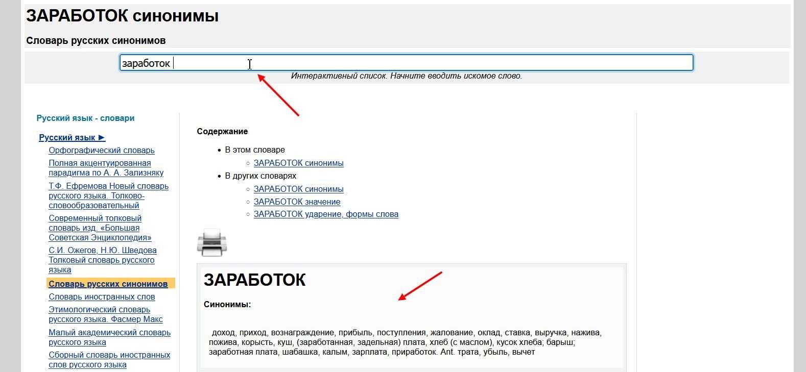 Еще один простой сервис для поиска синонимов в Интернете. Это словарь русских синонимов и чтобы им пользоваться, введите на сервисе в поле поиска слова, далее нажмите кнопку «Enter» на клавиатуре. Опустите страницу вниз и заметите список доступных синонимов. Также, внизу будут еще слова похожие по смыслу.