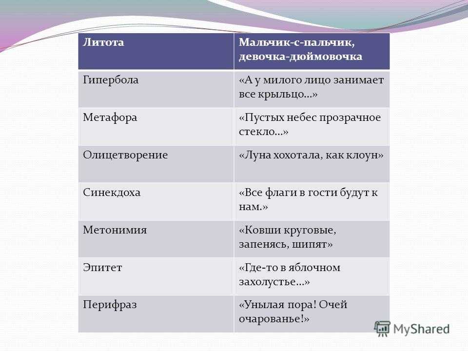 ЛитотаМальчик-с-пальчик, девочка-дюймовочка Гипербола«А у милого лицо занимает все крыльцо…» Метафора«Пустых небес прозрачное стекло…» Олицетворение«Луна хохотала, как клоун» Синекдоха«Все флаги в гости будут к нам.» Метонимия«Ковши круговые, запенясь, шипят» Эпитет«Где-то в яблочном захолустье…» Перифраз«Унылая пора! Очей очарованье!»