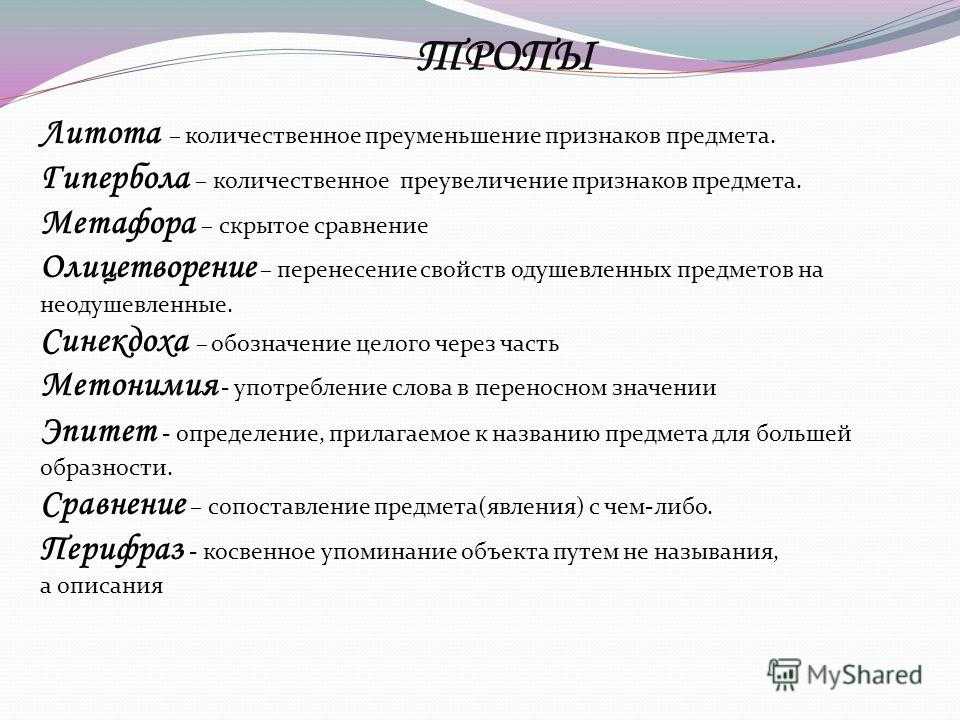 Познакомимся поближе с основными видами средств выразительности речи, а именно с тропами, поскольку они чаще всего попадаются в экзаменационных заданиях. Для этого разберем каждый по отдельности.