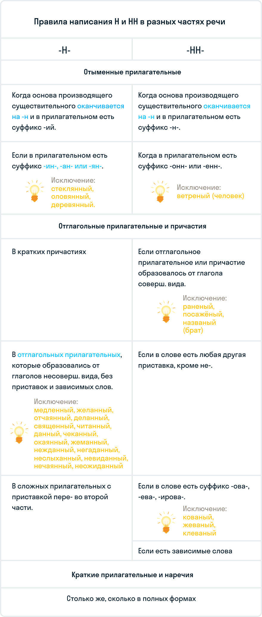 Чтобы вам было удобнее возвращаться к правописанию удвоенной Н, мы собрали все правила в одну сводную таблицу ниже. Пользуйтесь!