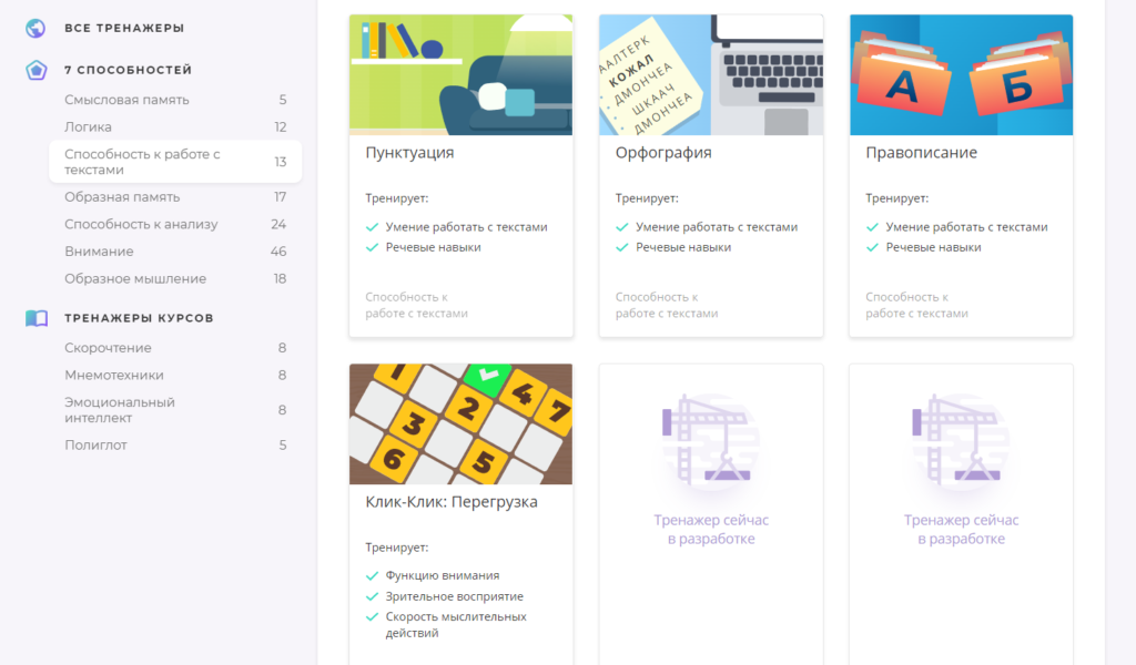 Весь русский язык там собран в одной вкладке – «Способность к работе с текстом». Суммарно там сейчас 8 тренажеров, скоро появится еще несколько