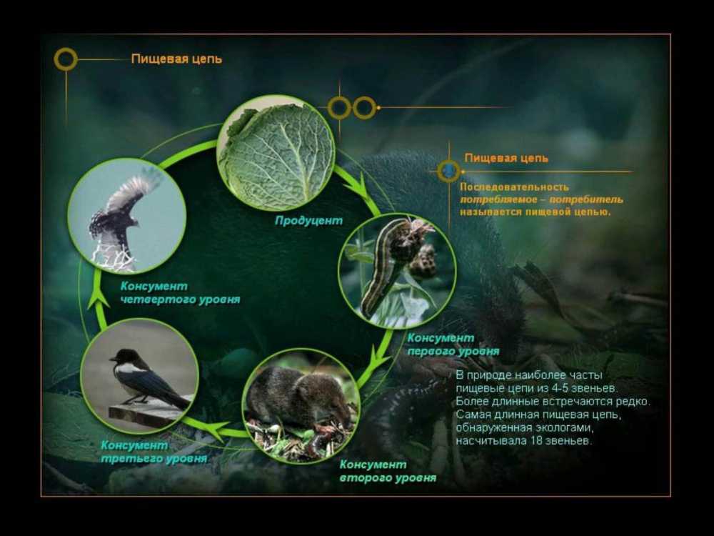 Это процесс, обеспечивающий перенос или обмен энергией и веществами, позволяющий последним циркулировать в биосфере. При этом энергетические потери составляют больше 80 % — они выделяются в виде тепла. Цепь имеет линейную структуру (вариант — экологическая пирамида), составляется из нескольких звеньев. Они в свою очередь могут состоять из одной или нескольких групп живых существ, служащих пищей для вышерасположенных ярусов.