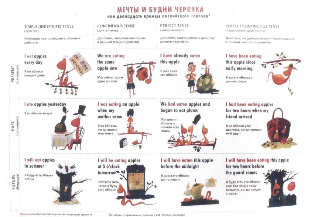 Во-первых, к любому заданию можно подойти с креативом и с игровой точки зрения. Даже времена английского языка для детей будут веселыми и интересными, если добавить к занятиям интерактива и игр. Сохраняйте себе картинку-помощницу для изучения времен английского глагола. Приключения червячка куда веселей, чем просто правило и пример.