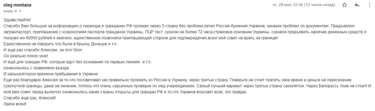 Ниже цепляю скрин из своей почты с отзывом от человека который прилетел в Украину из России через Армению.
