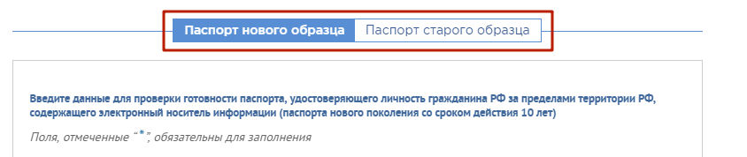 - Выбор типа заграничного паспорта. Доступна проверка готовности документов как нового, так и старого образца, но формы запроса несколько различаются.
