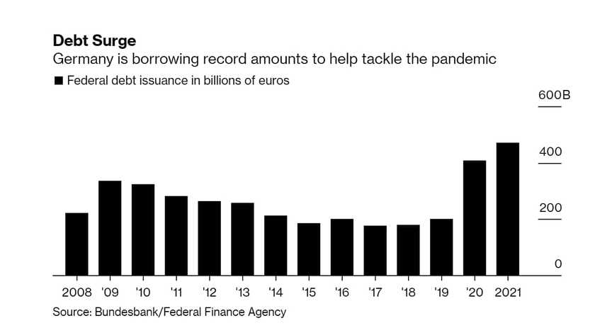Германия выпустила рекордный объем долговых обязательств для борьбы с последствиями пандемии COVID-19, ежегодные заимствования с 2020 года примерно вдвое превышают темпы последних лет. Объем выпуска в 2022 году составит около 410 млрд. евро.