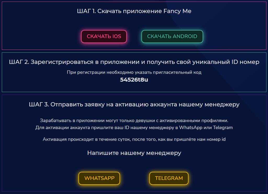 Подробная информация о приложении и кнопки для скачивания представлены на официальном сайте . Процедура создания учетной записи не сложная, после запуска программы на смартфоне, нужно будет придумать себе логин, выбрать аватарку, добавить пару фото и потом связаться с менеджерами через WhatsApp или Telegram: