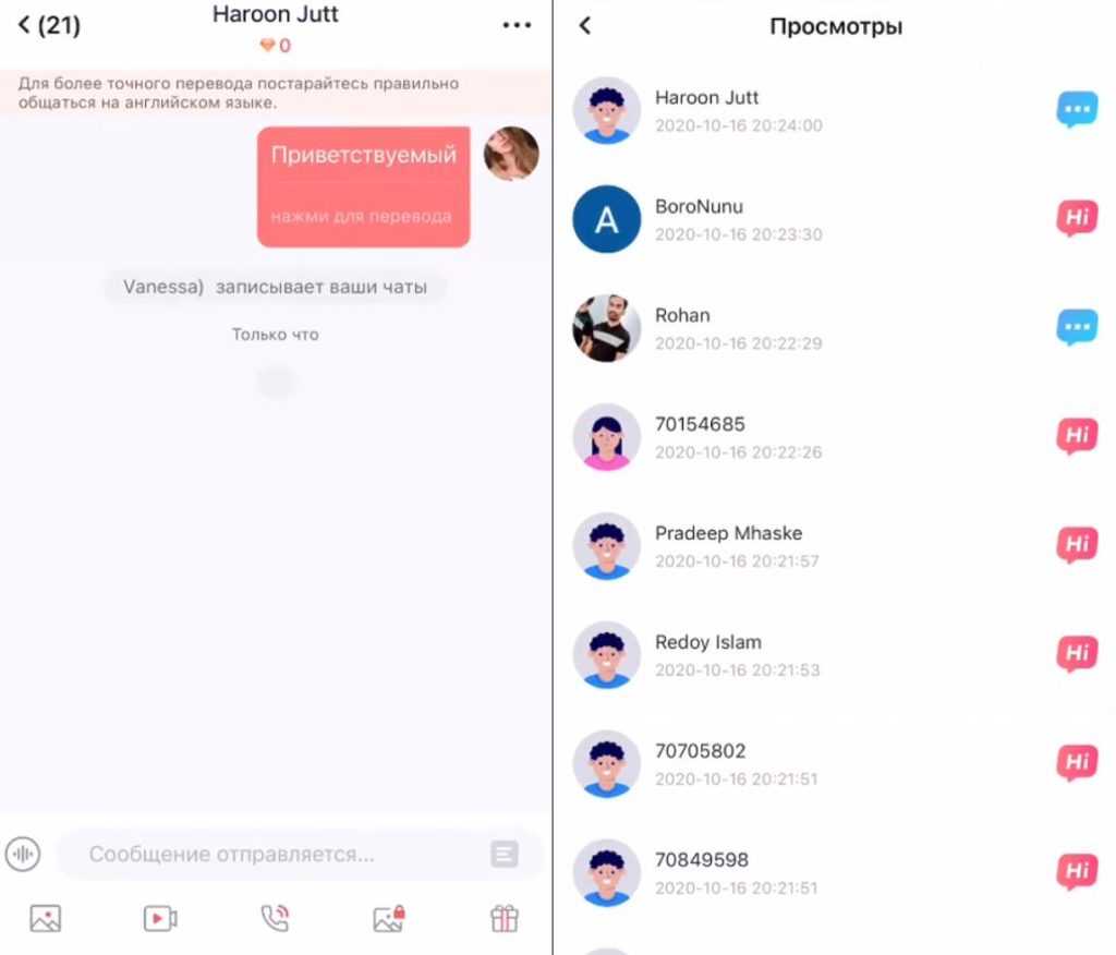 В приложении установлен переводчик, он помогает обмениваться текстовыми сообщениями. Но намного эффективнее разговаривать на английском.