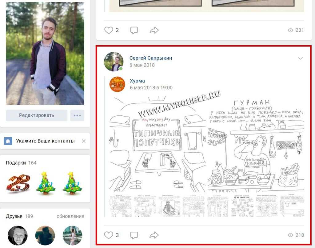 Сразу к примерам. Первый — это репост на моей собственной странице ВКонтакте. Я сохранил серию смешных картинок, чтобы их увидели мои друзья и я в случае необходимости не потерял эту запись.