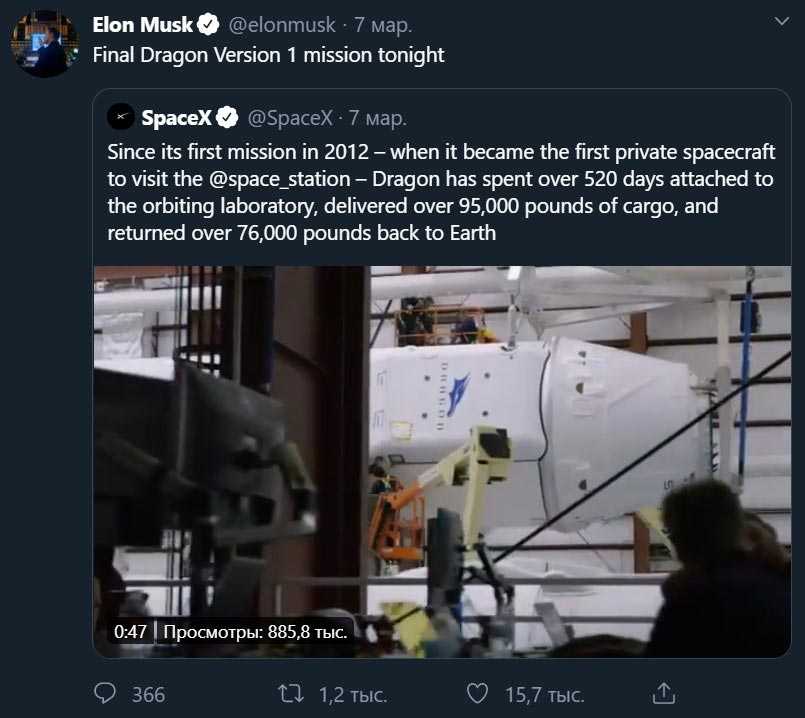 Второй — репост в твиттере Илона Маска. На своей странице он разместил репост твита компании SpaceX, основателем которой является, по поводу проведения очередной космической миссии.