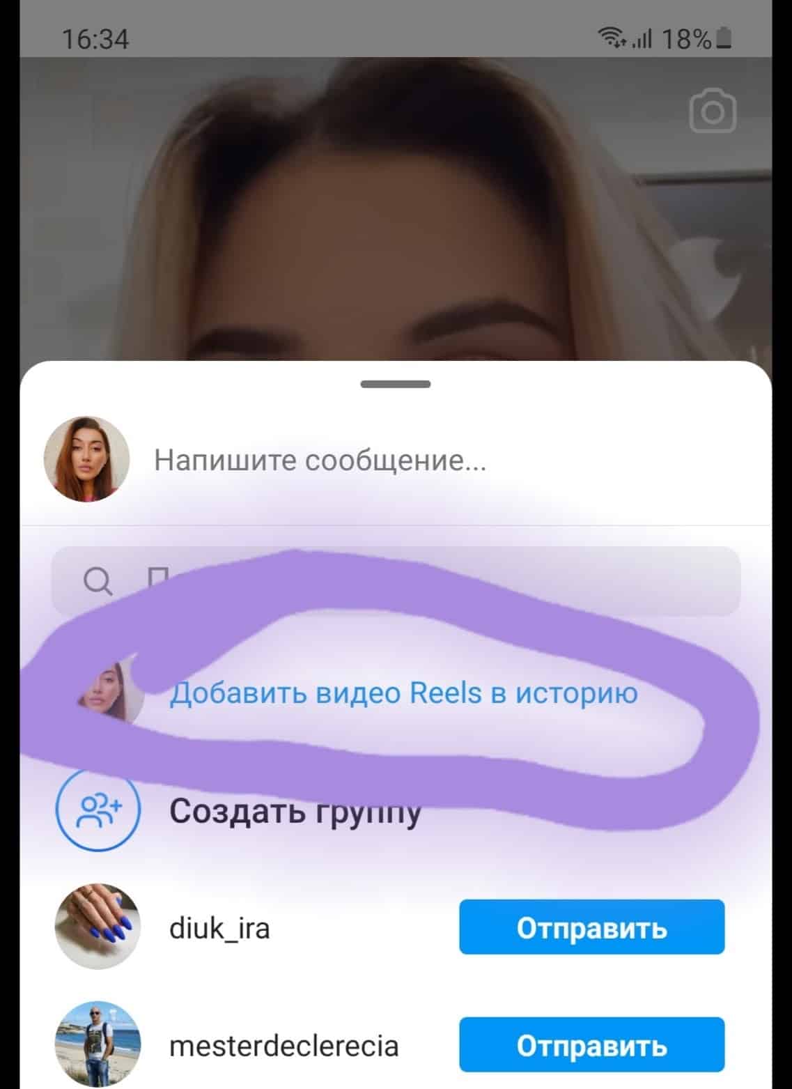 - Чтобы вставить ссылку на видео IGTV (Reels), нужно открыть видео IGTV (чье-то или свое), затем нажать на иконку самолета (рядом со значком лайка и комментария). В открывшемся окне выбрать фразу «добавить видео в свою историю»