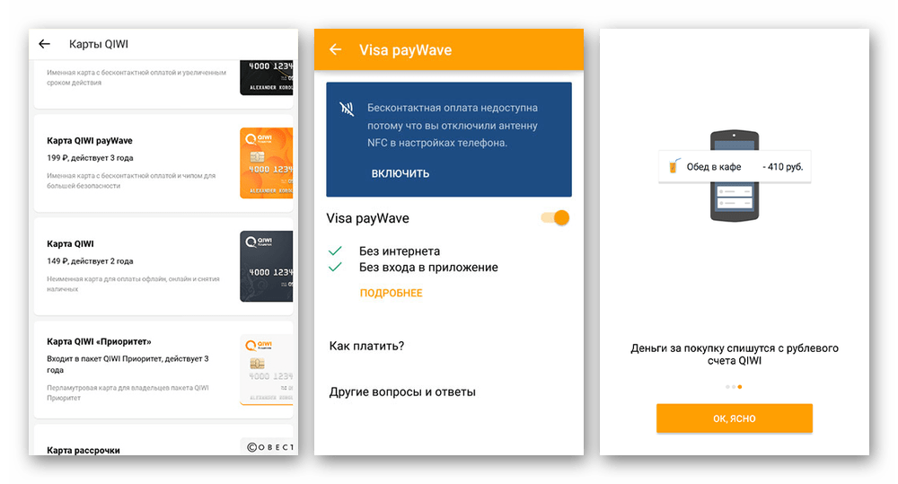 Кошельком в платежной системе Qiwi пользуется огромное количество людей, которым, как и в прошлом случае, доступно мобильное приложение с определенными возможностями. К их числу относится бесконтактная оплата товаров через технологию NFC. Для использования подобного вида расчета нужно иметь аккаунт в системе и завести карту «Qiwi PayWare».