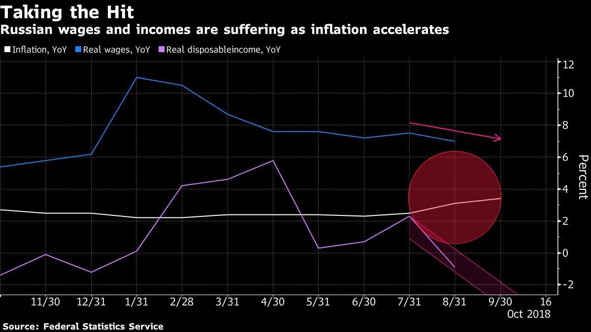 Инфляция (белая линия), реальная заработная плата (синяя линяя), реальный располагаемый доход