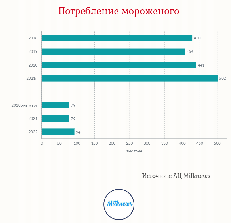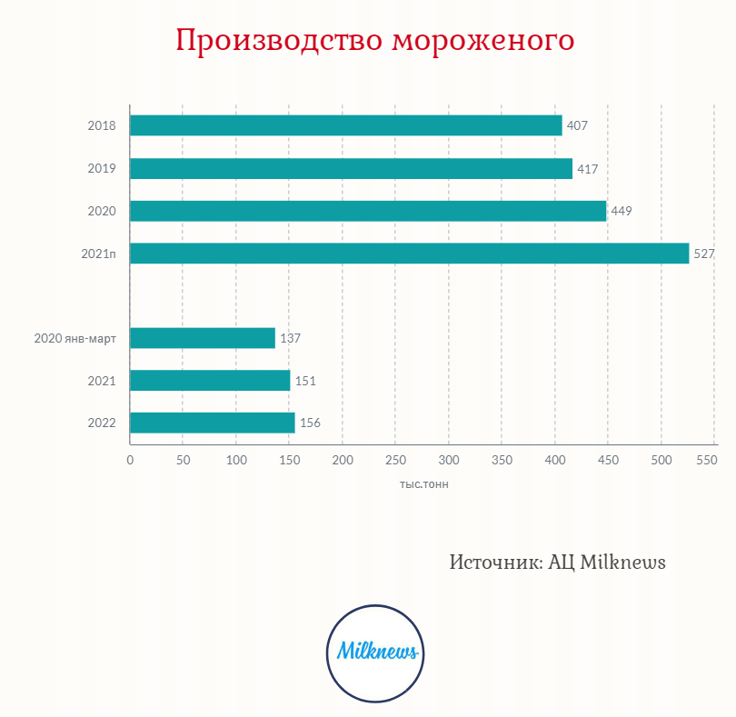 По данным Союзмолоко, с января по март текущего года потребление мороженого относительно аналогичного периода прошлого года увеличилось на 18% — до 94 тыс. т с 79 тыс. т соответственно. Производство мороженого с января по апрель 2022 выросла до 156 тыс. т со 151 тыс. т в аналогичный период 2021-го. Ежегодный прирост рынка CAGR оценивается в 9%. Уровень самообеспеченности превышает 100% и вырос на 3 процентных пункта год к году.