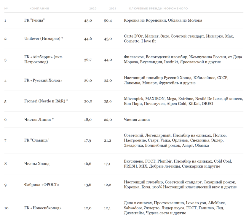 За 2021 год новый лидер «Ренна» увеличил отгрузки мороженого на 17,2%, до 50,4 тысячи тонн, в то время как выпуск мороженого Unilever вырос менее чем на 1 процент до 45 тысяч тонн. На третьем месте — группа компаний «Айсберри» (марки «Пломбир Вологодский», «Филевское»). У нее объемы выпуска достигли 44 тысяч тонн мороженого, что на 19,9% больше, чем годом ранее.