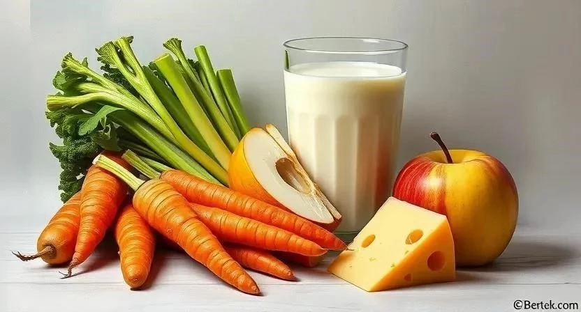 Ответ: Молочные продукты, рыба, орехи, фрукты и овощи, богатые кальцием и витамином C.