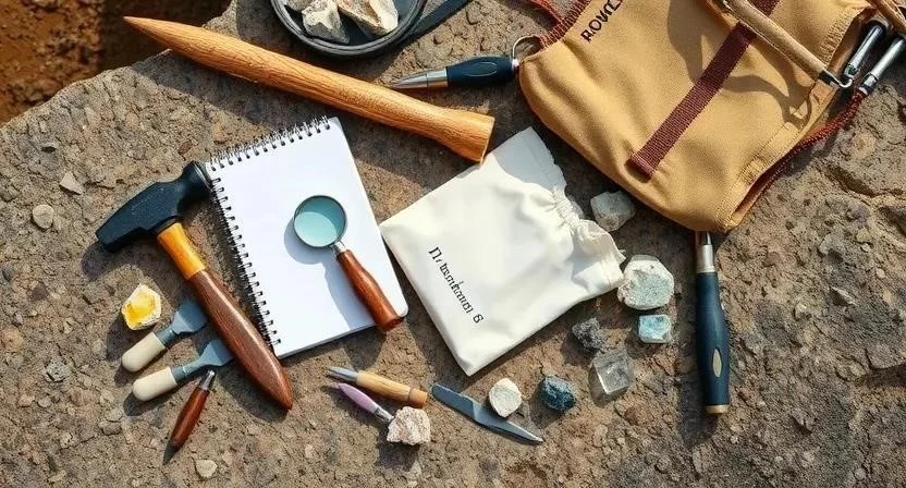 Какие инструменты необходимы для поиска минералов? Молоток, зубило, лупа, мешочек для хранения, защитные очки и перчатки.