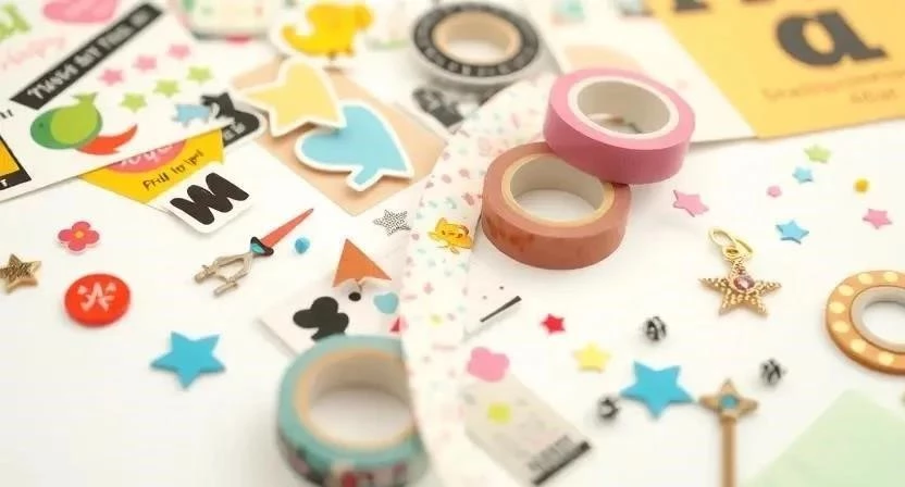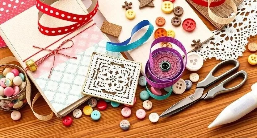 - Декоративные элементы: Наклейки, ленты, кружево, пуговицы, стразы, вырезки из журналов.