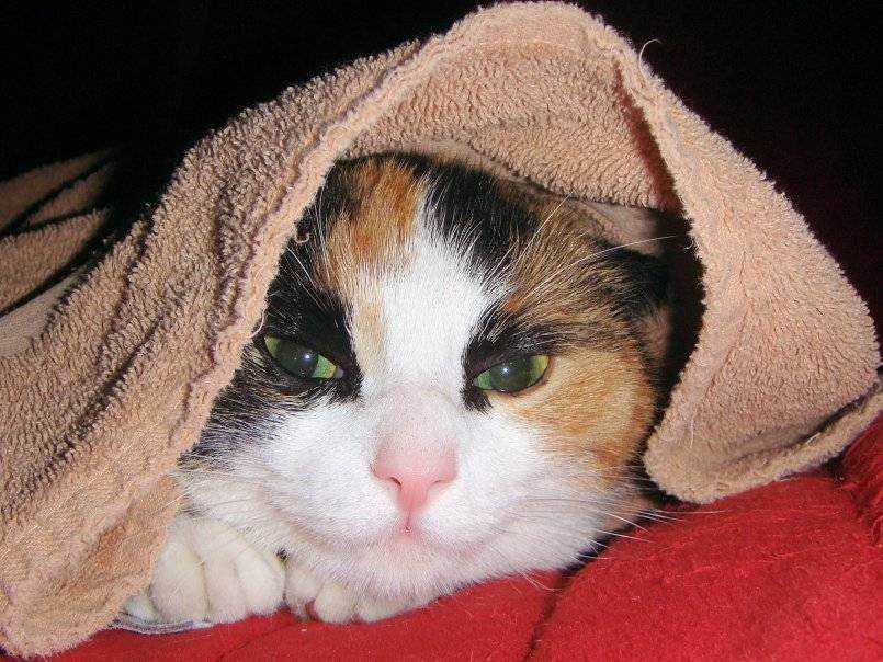 Когда шампунь смыт, вытащите мурлыку из воды, оберните большим полотенцем и на несколько минут обнимите свой «кокон». Кошка должна прийти в себя и успокоиться.
