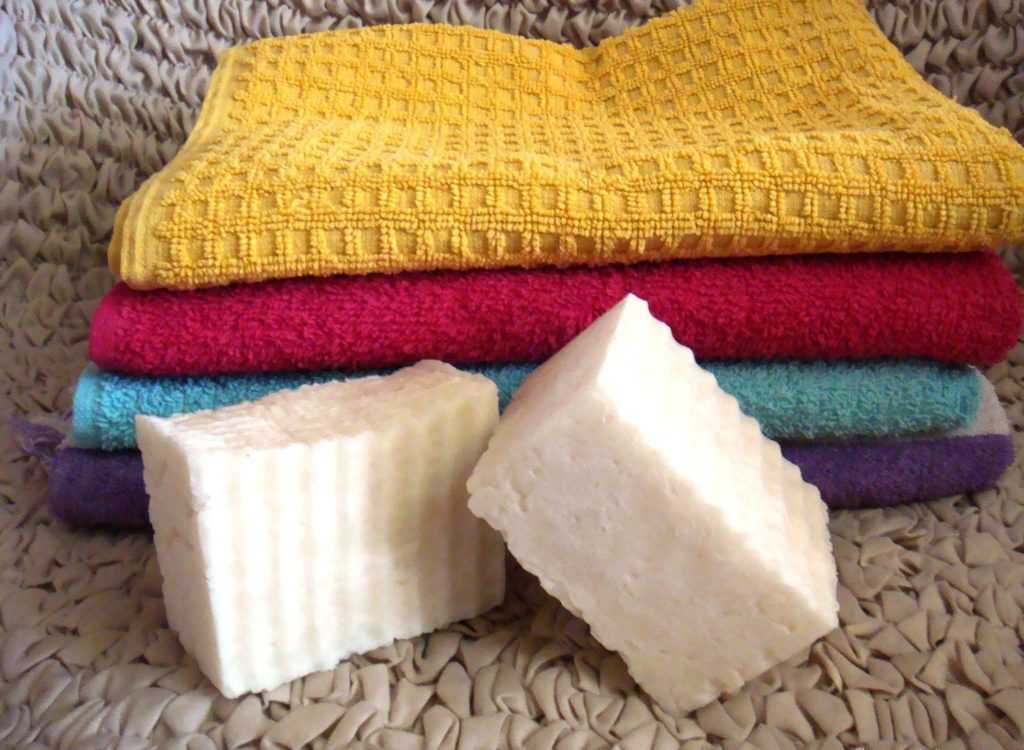 - Половину бруска хозяйственного мыла надо измельчить, растворить 3 л теплой воды. Полотенца с жирными пятнами поместить в полученный раствор на 5-6 часов. Далее стирать удобным способом.