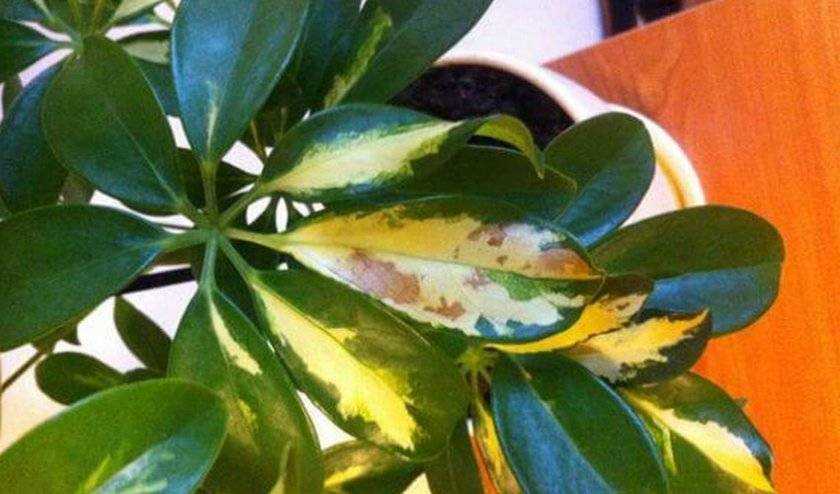 Почему пестролистные листья начинают бледнеть? Эта разновидность отличается самой высокой потребностью к освещению. И если зонтичному деревцу без узора нужно небольшое затенение, для этой шеффлеры важен хороший свет.