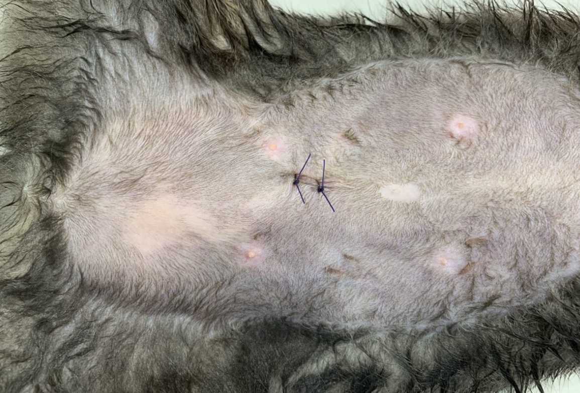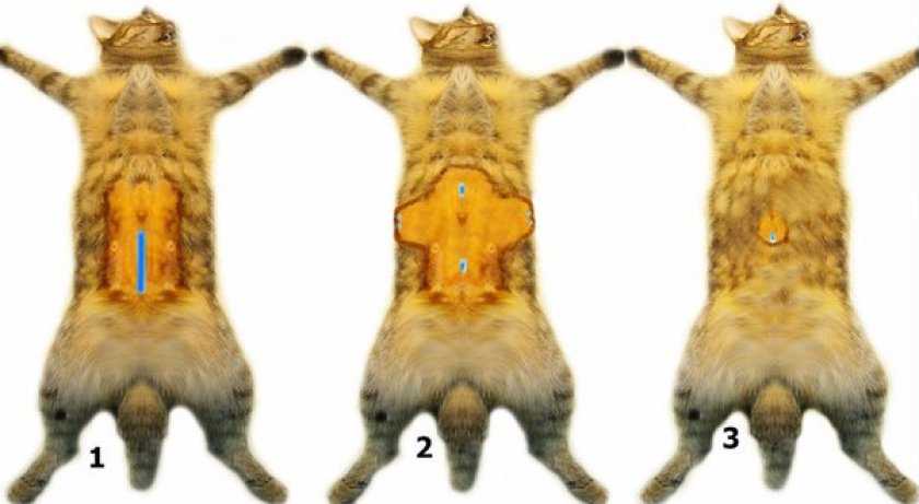 - Классический метод. Представляет собой рассечение кожи на предварительно подготовленном участке по белой линии живота немного ниже пупка. Длина разреза составляет около 3 см. Этот метод позволяет удалить и матку, и яичники. Его преимуществом является возможность прямого доступа специалиста к органам кошки. Недостатком считают большую длину шва, что может спровоцировать проникновение инфекции и развитие кровотечения.