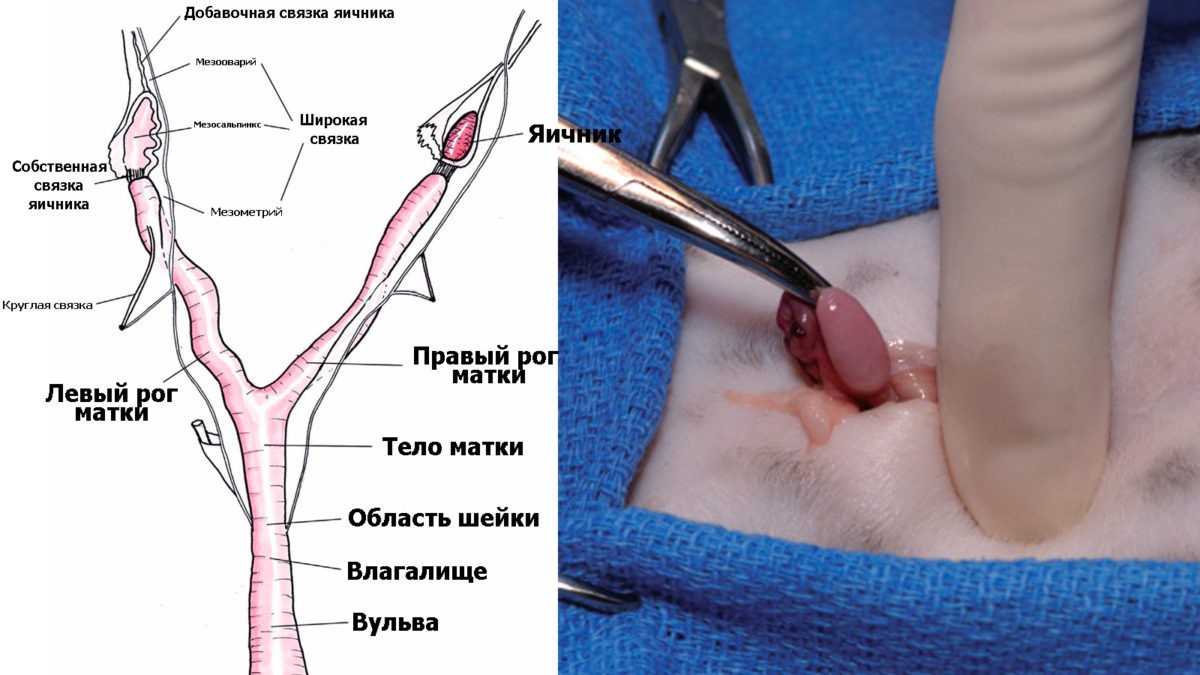 (A) Схематическое изображение яичников и матки кошки; (B) Интраоперационная фотография яичника кошки