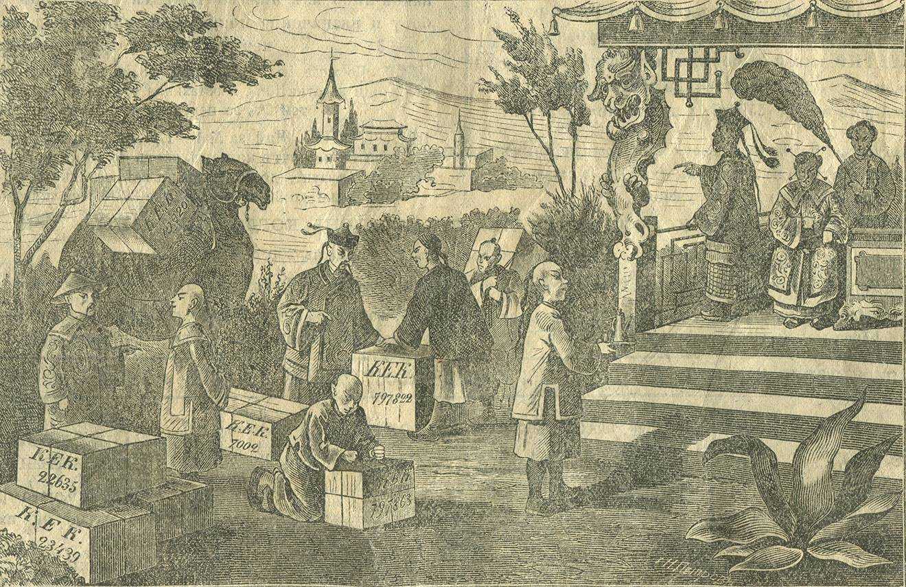Приготовление чая в Китае и отправка его в Россию. Гравюра XIX векаИз коллекции автора