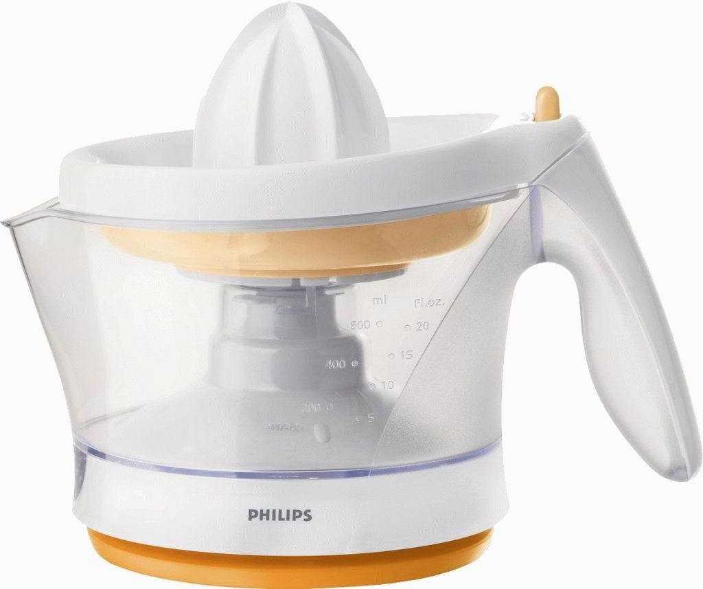- PHILIPS Daily Collection HR2738/00 — очень дешевая модель, которая идеально подойдет любителям сока цитрусовых. Устройство имеет небольшую мощность в 25 Вт. Корпус изготовлен из полипропилена. Объём ёмкости для сока составляет 0,5 л. Весит аппарат чуть больше 0,5 кг. Цена соковыжималки в России — порядка 1 370 рублей. Цена в Украине — 600 гривен.