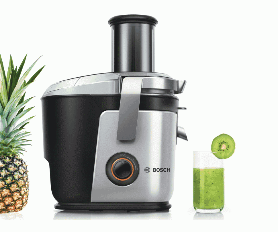 - Bosch MES25A0/25C0/25G0 — модель центробежного типа. Подходит для обработки фруктов и овощей большого диаметра. Несмотря на высокую производительность, это скорее устройство для получения небольшого количества фреша на семью. Здесь нет отдельного резервуара для сока (он сразу стекает по желобку). Кроме того, аппарат не очень хорошо справляется с твёрдыми овощами. Но за свою цену он достаточно функционален и надёжен. Цена в России — 5 650 рублей. Цена в Украине — 3 900 гривен.