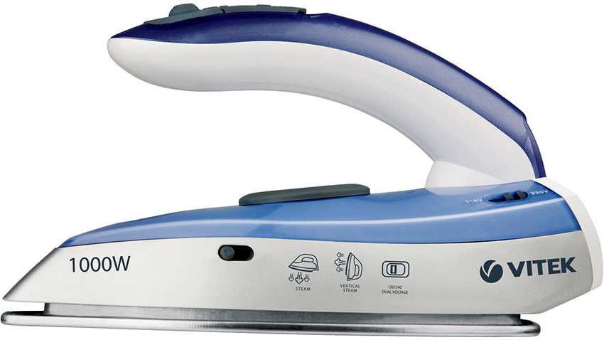 VITEK VT-1227. Мощный прибор (1000 Вт), который рассчитан как на сухую, так и на влажную утюжку с использованием пара. На подошве имеется специальный желоб для удобного обхода пуговиц. Главные достоинства: