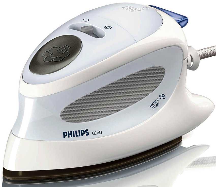 Philips GC 651. Отличается привлекательным дизайном и присутствием системы вертикального отпаривания, позволяющей утюжить одежду, которая висит на вешалке. Подошва характеризуется наличием антипригарного покрытия, а ручка выполнена из мягкого материала, обеспечивающего комфортное удержание в руке. Главный минус – отсутствие складной ручки. Цена – 1,7 тыс. рублей.