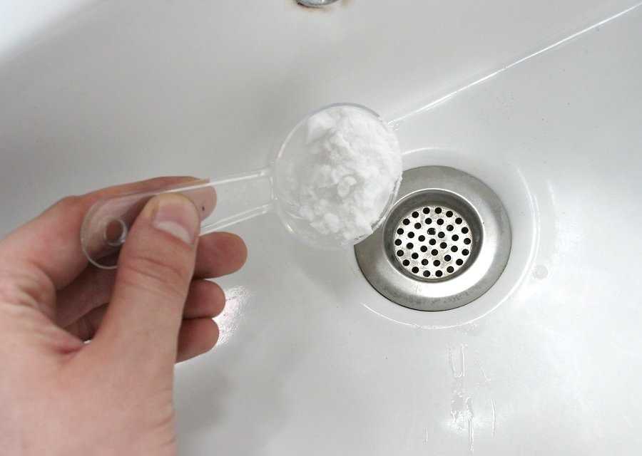 - В сливное отверстие насыпается сода. Количество соды должно быть не менее, чем 1 стакан.