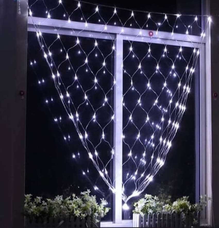 - Сетка – провода имеют форму ромбов или квадратов, на углах которых находятся источники света. Такими гирляндами чаще всего украшают окна и стены.