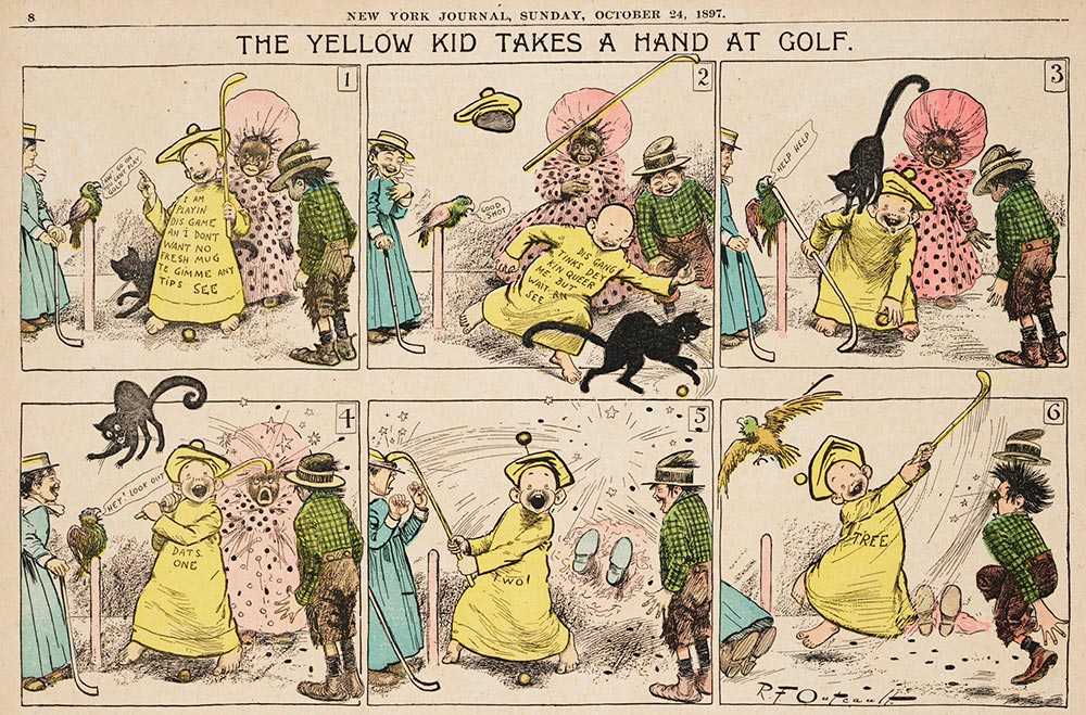 В это время в каждом воскресном номере журнала NYW выходила серия комиксов под названием Hogan’s Alley, рисовал их Ричард Ауткольт. Ее главным героем был мальчик Мики Дьюган, который получил прозвище «Желтый малыш». Он был типичным представителем низших слоев общества США, в своей речи он использовал сленг, а желтым был назван за цвет ночной рубашки, на которой были написаны разные лозунги.