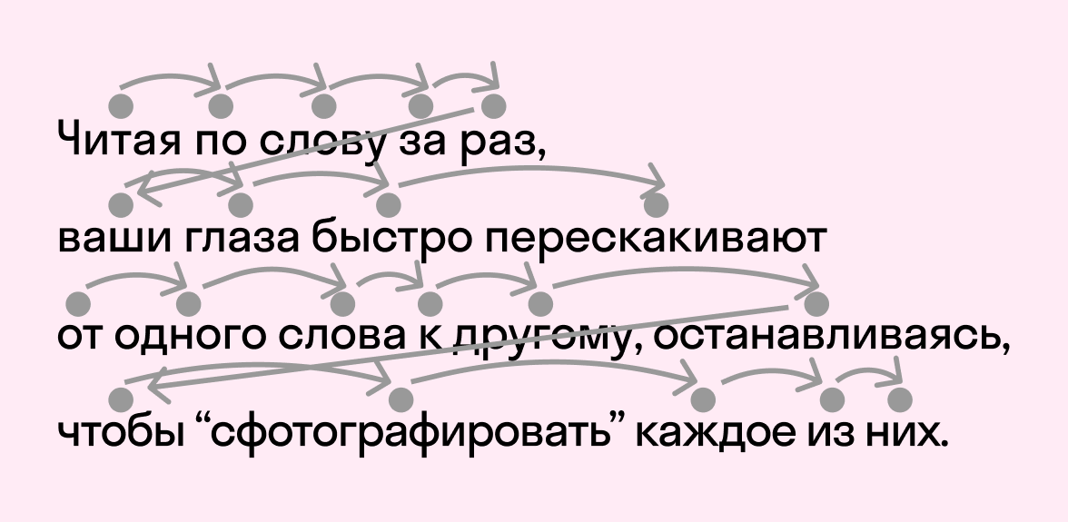 Чтобы понять, как читать быстро, нужно разобраться, как вообще происходит этот процесс. Что мы делаем во время чтения? Следим глазами за текстом, но не линейно, а скачками — фиксируемся на одной группе слов, затем переходим к следующей, а иногда останавливаемся на осмысление или отходим назад. Такие движения (их называют саккады) занимают считанные доли секунды, но они происходят непрерывно, поэтому в целом замедляют чтение.