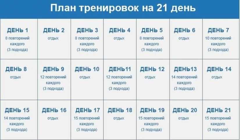 Программа занятий должна быть составлена таким образом, чтобы чередовать работу разных групп мышц и отдых. Это позволит не создавать излишнее напряжение для организма.