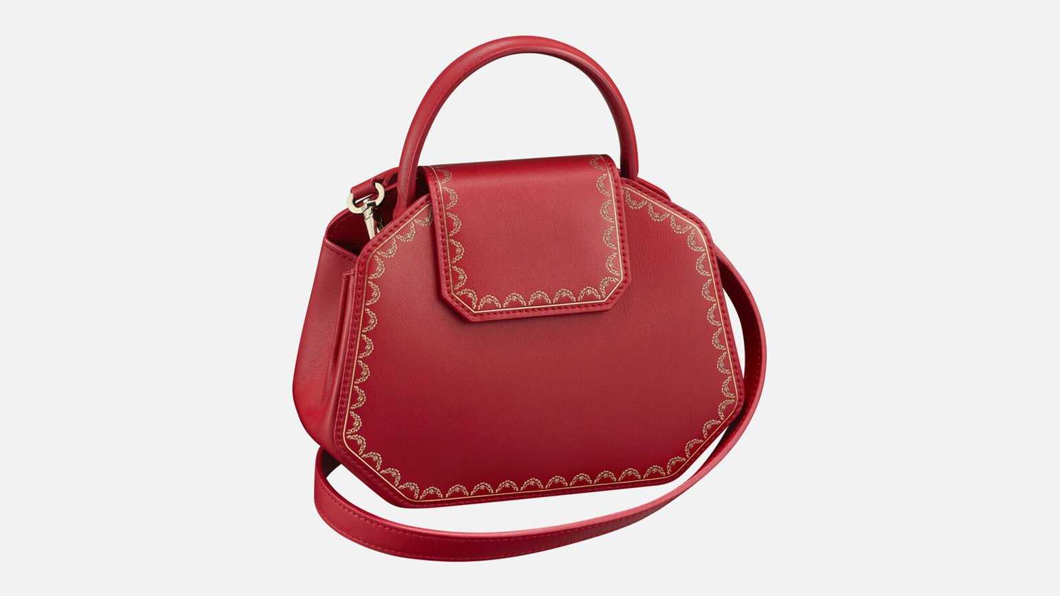В 2019 году Cartier выпустил красную сумку по мотивам своего фирменного футляра, в её дизайне — такие же шесть углов с золотой гирляндой по краю.