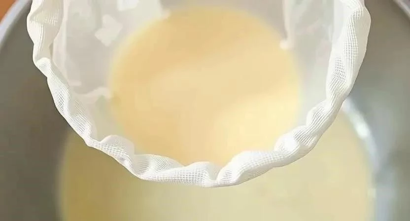 - Выстелите дуршлаг марлей и вылейте в него свернувшийся кефир.