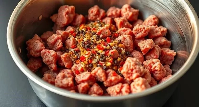 - Тщательно перемешивайте фарш, чтобы специи равномерно распределились.