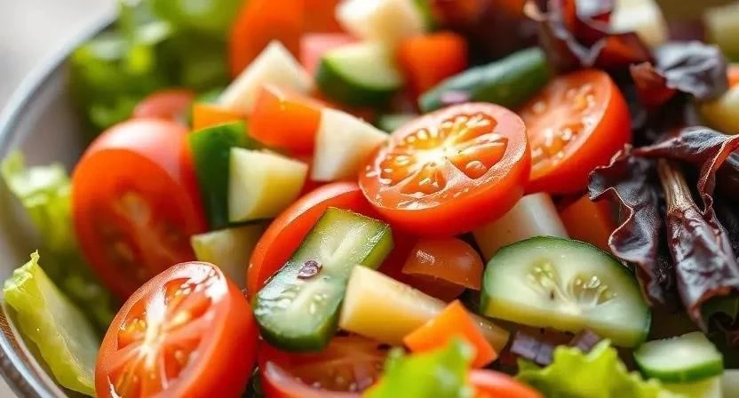 - Салат из огурцов и помидоров с зеленью: Легкий и освежающий салат, который можно подавать с растительным маслом и лимонным соком.