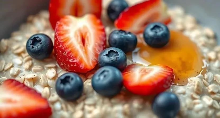 - Приготовление: Овсяные хлопья залить молоком и варить на медленном огне 5-7 минут. Добавить нарезанные фрукты и мед.
