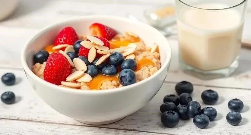 - Овсяная каша на миндальном молоке с фруктами: Сварите овсянку на миндальном молоке, добавьте свежие фрукты и немного меда.