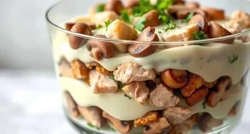 Слоеный салат с курицей и грибами