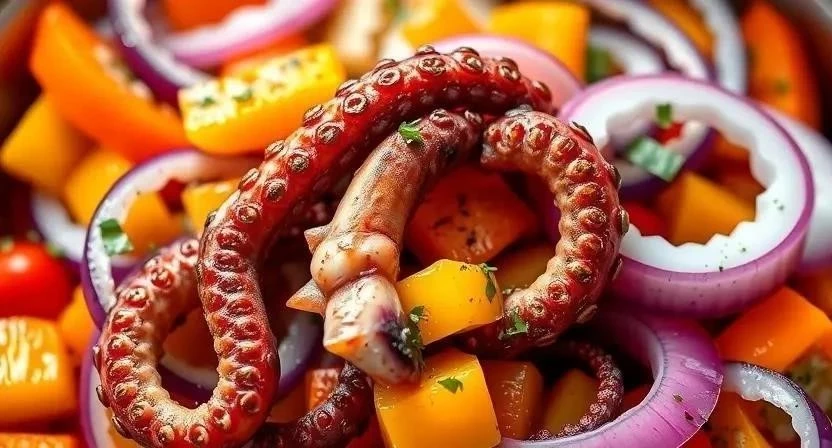 | Салат с осьминогом и овощами | Осьминог, огурец, помидор, красный лук, оливковое масло, лимонный сок | 150 ккал |