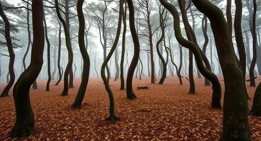 2. Прогуляйтесь по «Танцующему лесу». Это место, где деревья растут под необычными углами, создавая сюрреалистический пейзаж.